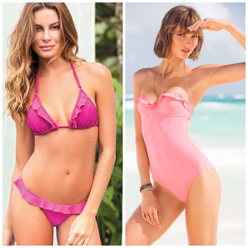 Ruffled detailing on a hot pink bikini set from CIA Maritima, a one piece swimsuit from Victoria’s Secret 2013 collection, and an off-white tankini with ruffles from Michael Kors |